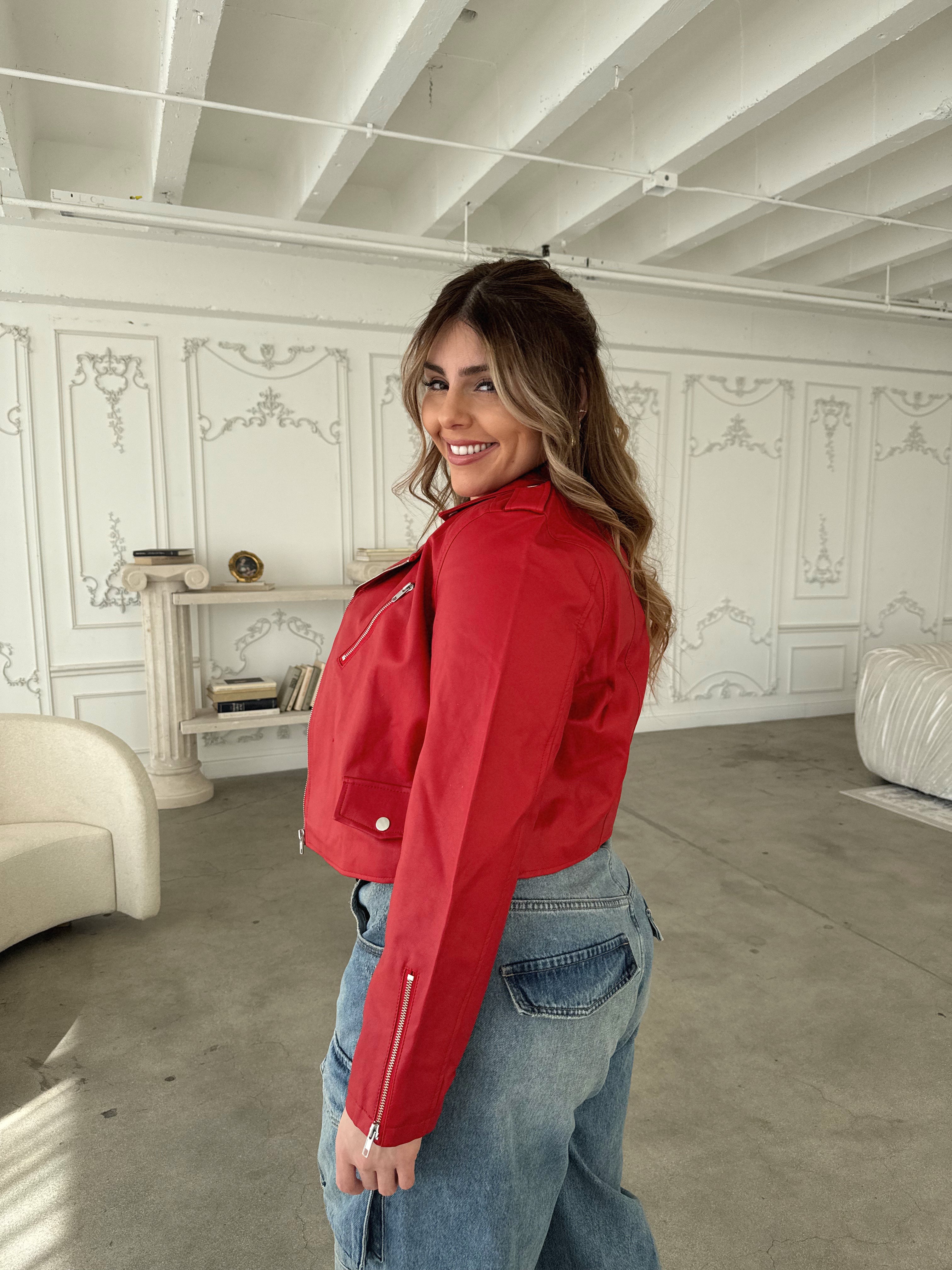 Show off your style with the ABBEY Red Faux Leather Jacket. Made with sleek faux leather and accented with silver hardware, this must-have piece is perfect for any outfit. Whether you're dressing up in a slip dress and heels or keeping it casual with a band tee and your favorite jeans, the ABBEY will add the perfect touch.