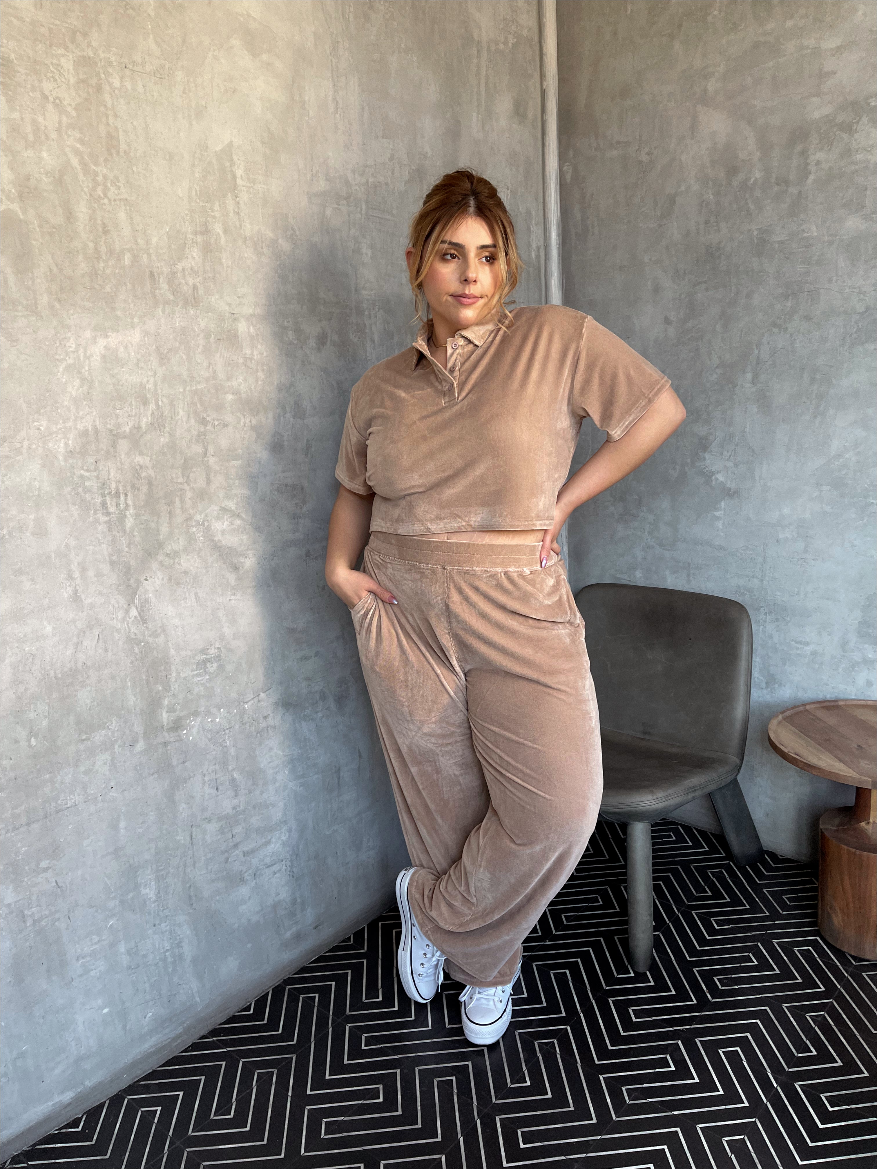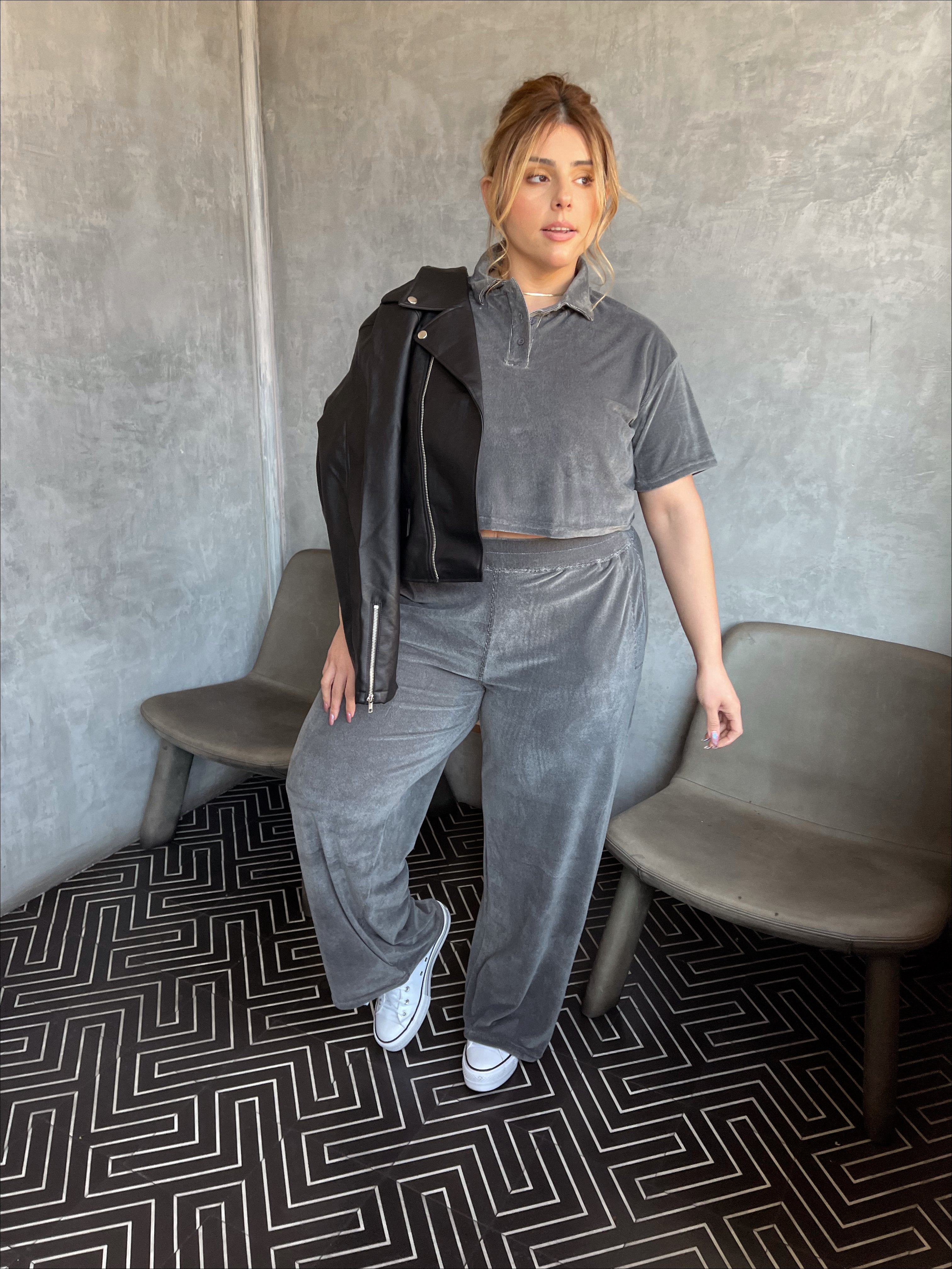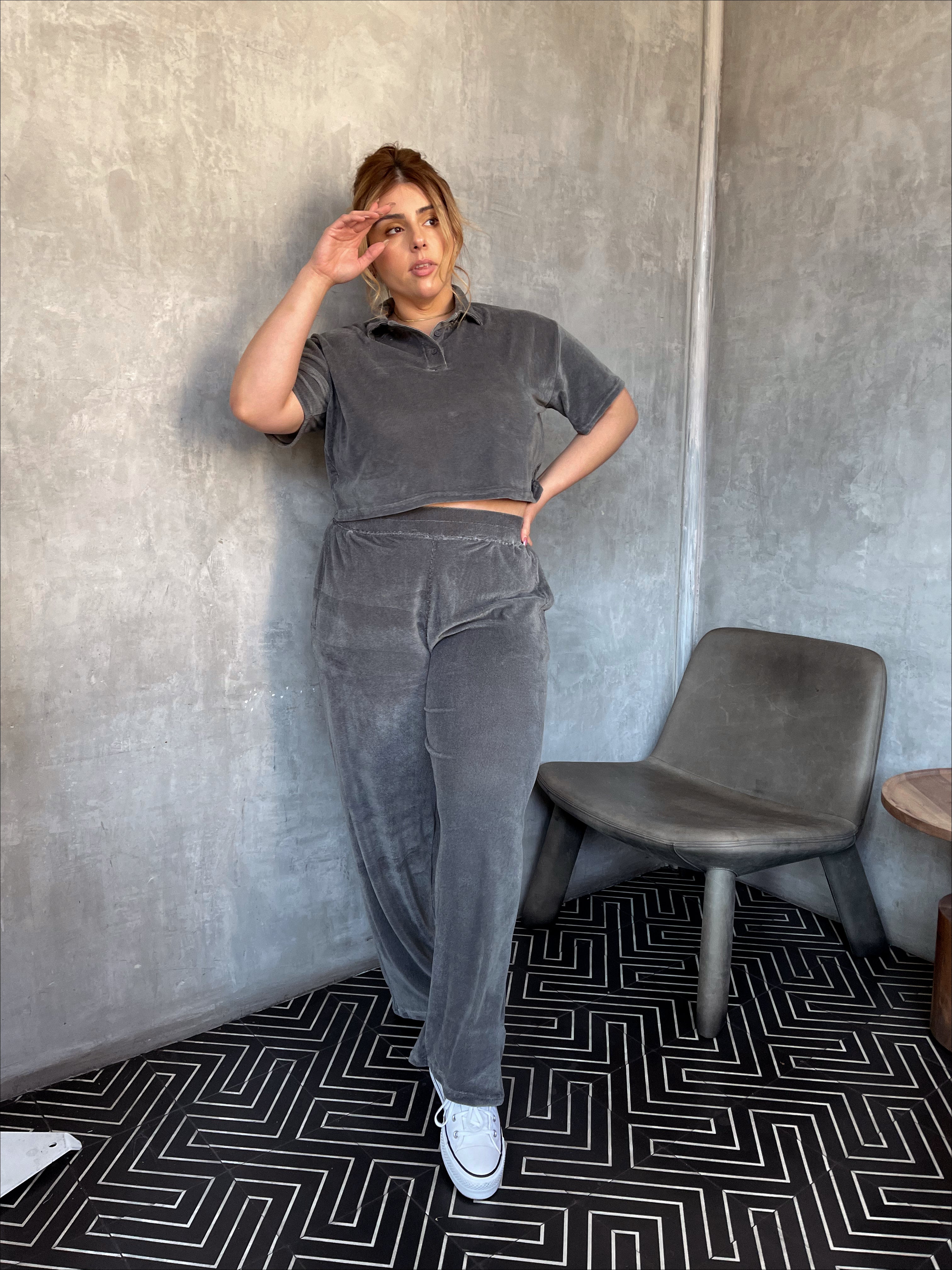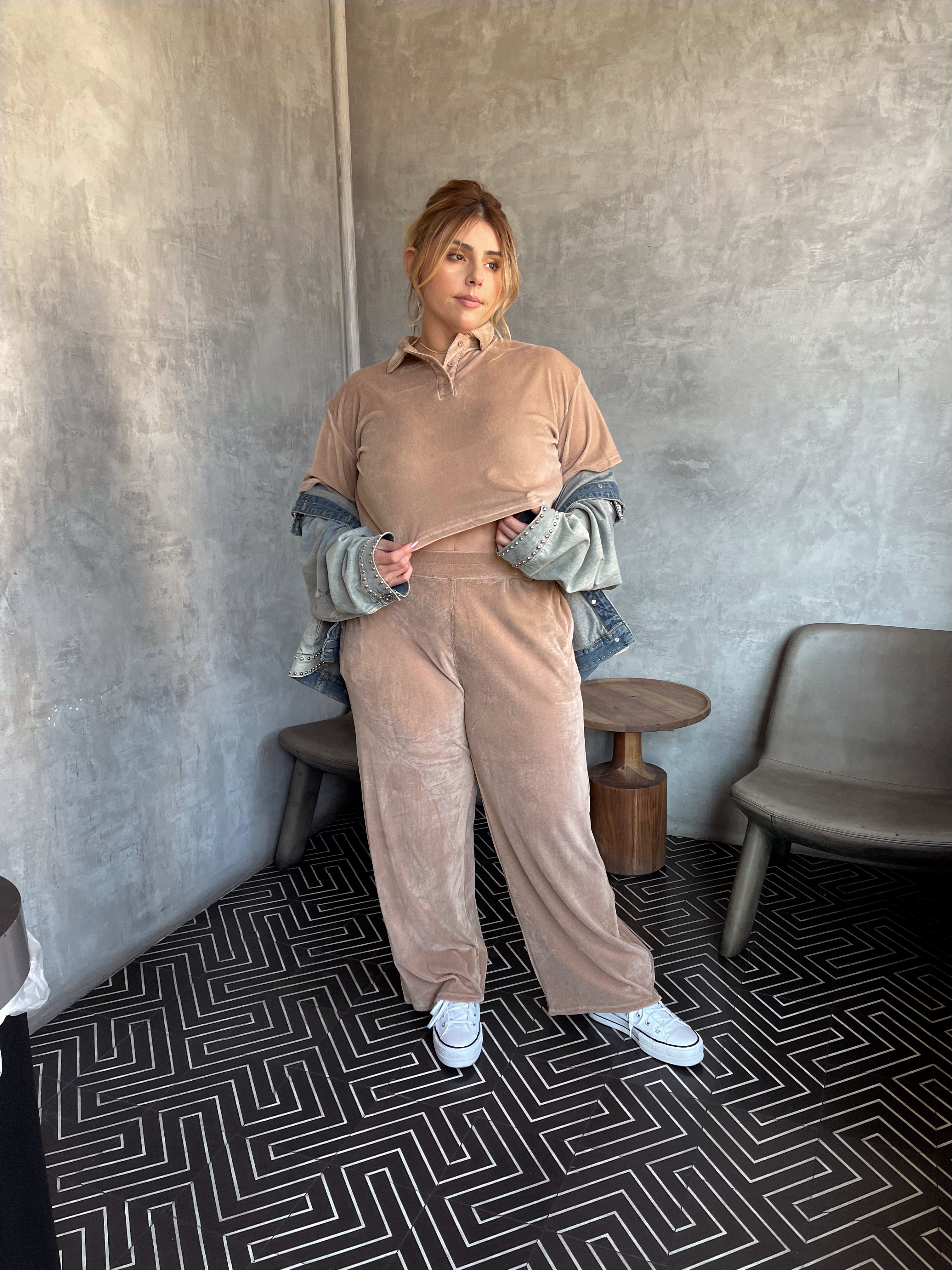 Need the perfect comfy outfit? BARE WITH ME just landed. Ultra soft velour rib fabric with an on trend cropped silhouette and relaxed wide fit bottoms. The ribbed crop polo top features a button closure and the high waisted wide leg pant has pockets! Throw this outfit on together or style separately!