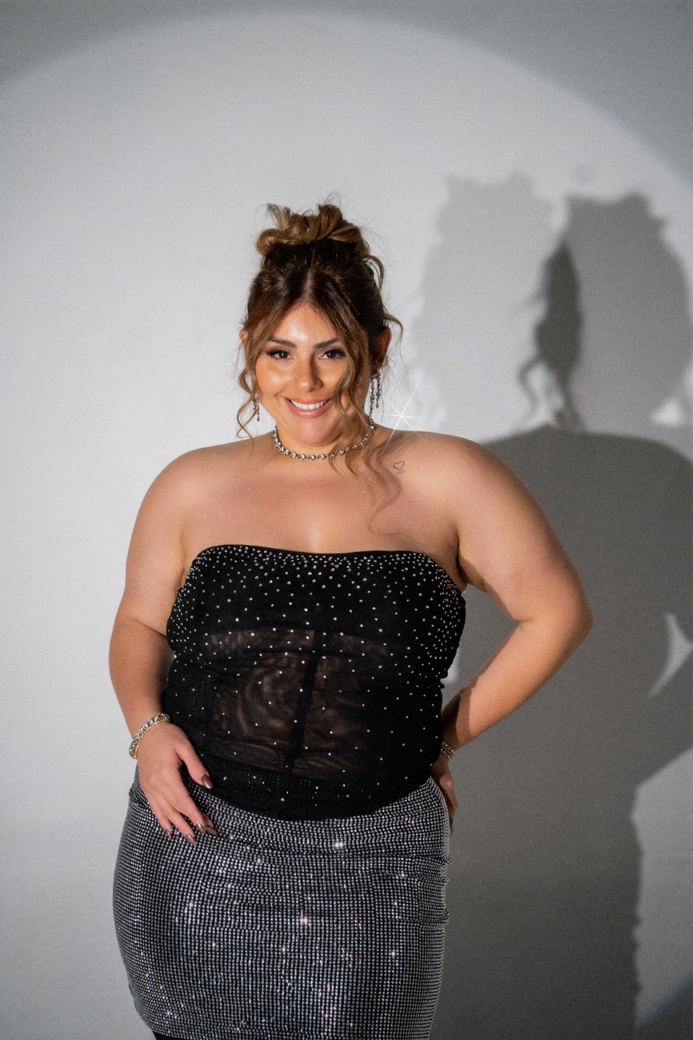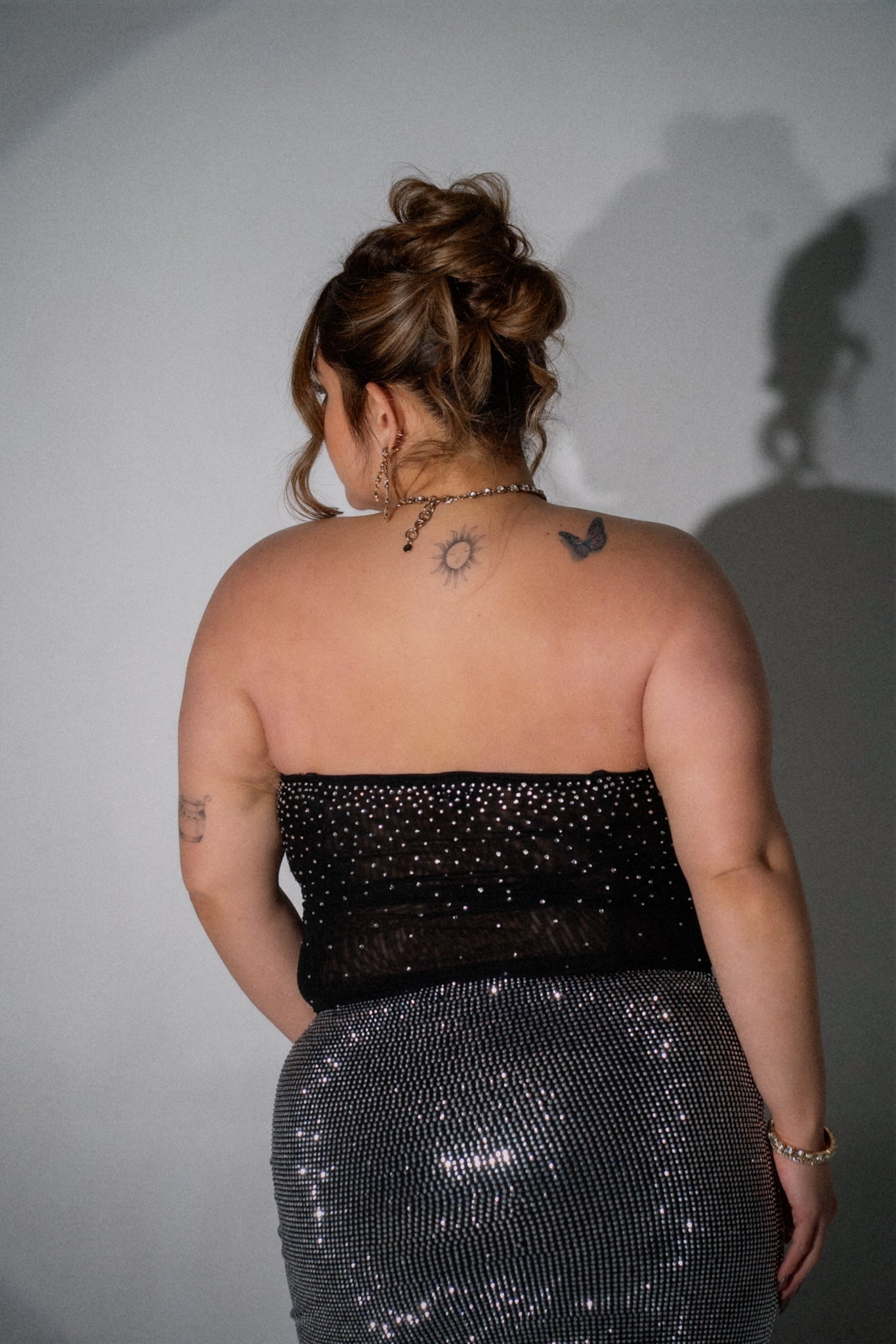 The MARQUEE Rhinestone Tube Top is your go-to for effortless glam. This stretchy tube top features eye-catching rhinestone detailing that catches the light with every move. Designed without boning for maximum comfort, the mesh construction offers a breathable, flexible fit that moves with you. Perfect for nights out, festivals, or whenever you want to shine. Pair it with your favorite bottoms and let those sparkles do the talking.