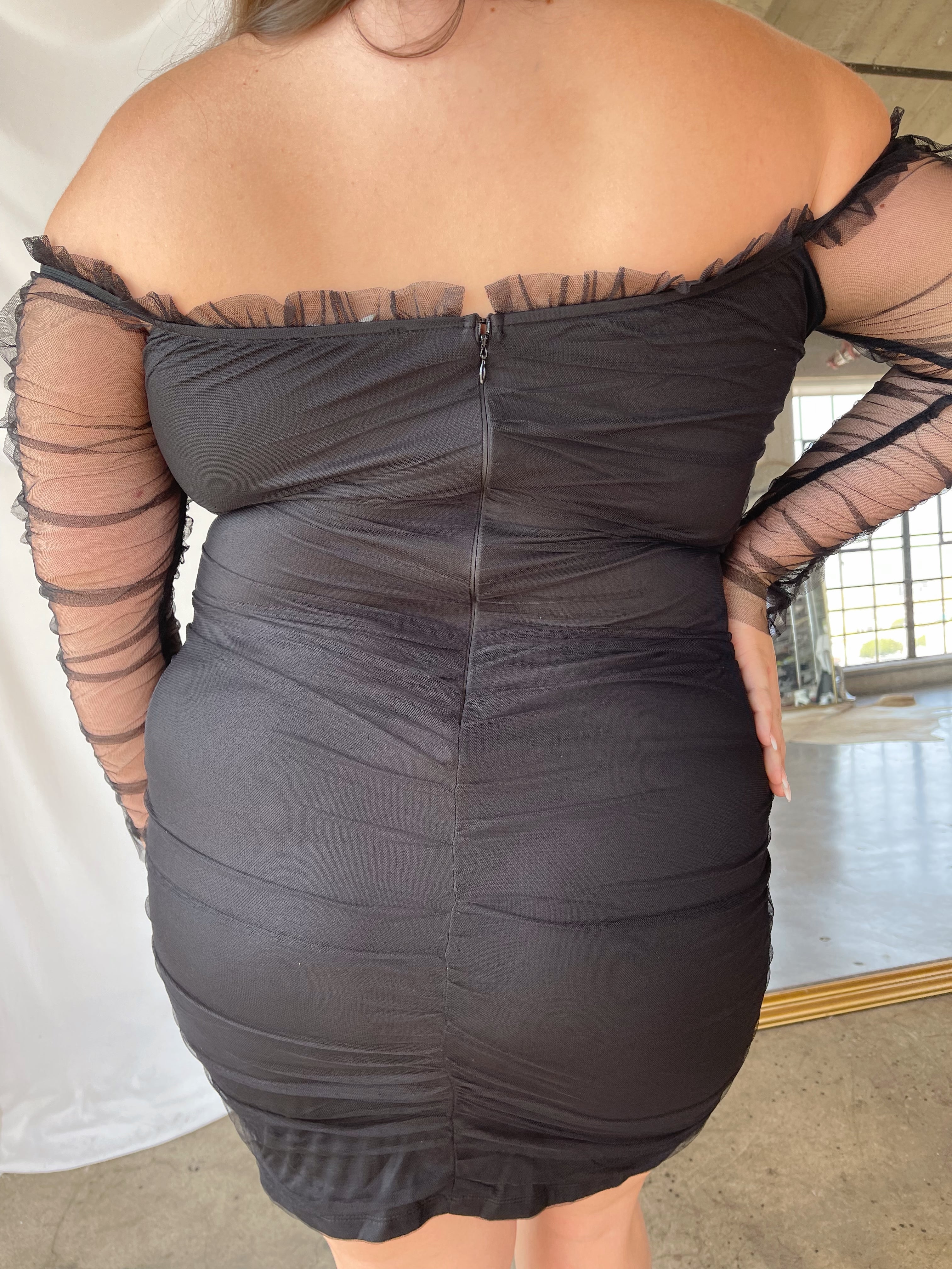 The BRIELLE features a mesh off the shoulder design with long sheer sleeves with a ruffle detail. Lace tie at the bust and a ruching effect. Wear this with your fav heels or dress it down with some boots!