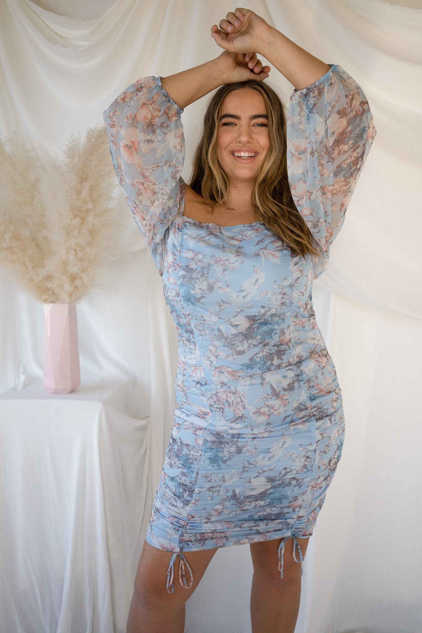This dress is smocked in the back for extra stretch and perfect fit. The front features two adjustable straps to shorten or lengthen it. The sleeves are oversized for a flow romantic touch, we paired it with strappy heels!