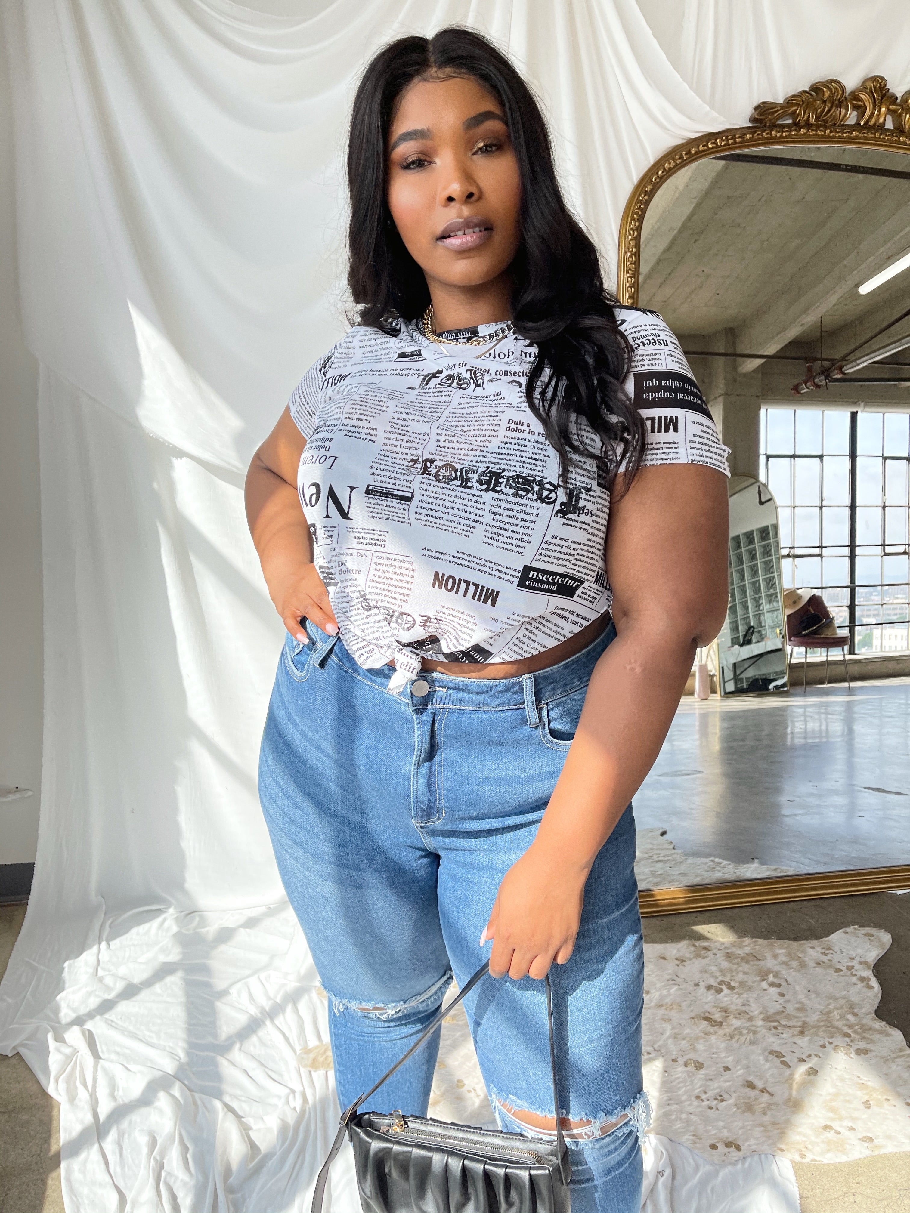 Extra read all about it! This just in, 90’s newspaper print top with a knot detail in front and longer in the back. Super stretchy and sheer, the print is giving us major SATC Dior print vibes and we’re here for it! Style it with your fav jeans or skirt.