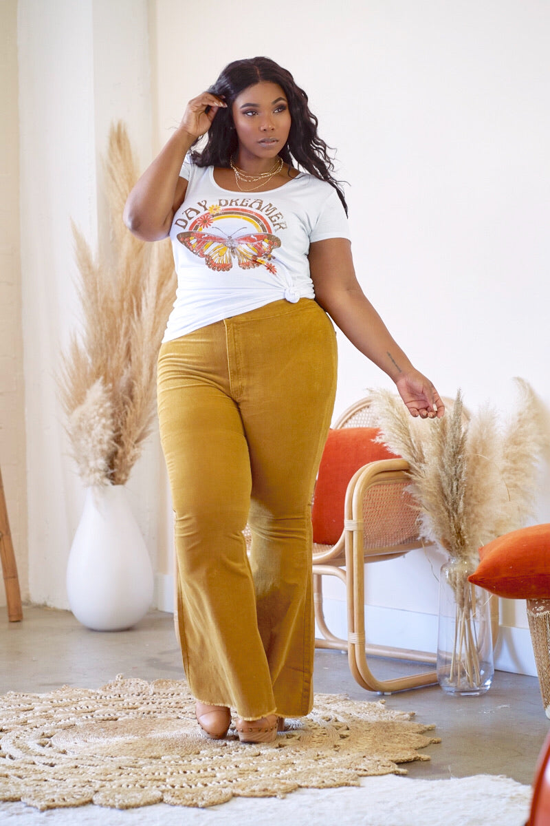 Be a DAY DREAMER in this new tee. Made of ultra soft and thin fabric perfect for summer. Scoop neck line, very stretchy and features a retro print. Pair with any type of denim and your fav sneakers!