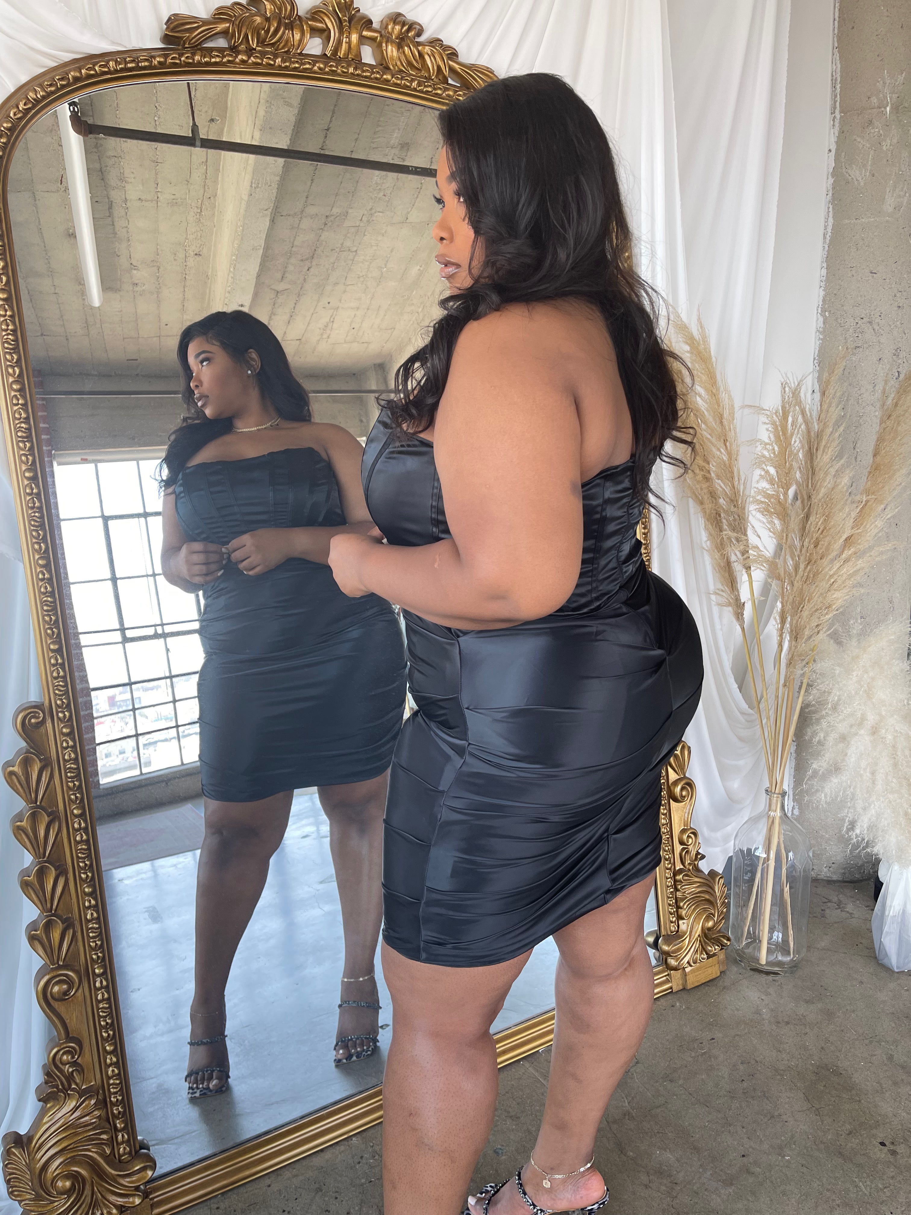 Meet ELIZA, features a flattering curved strapless neckline with mild boning and ruching for the perfect fit. Zip up closure with a sheer black overlay for a romantic touch. Wear this with your fav  heels for the perfect outfit!