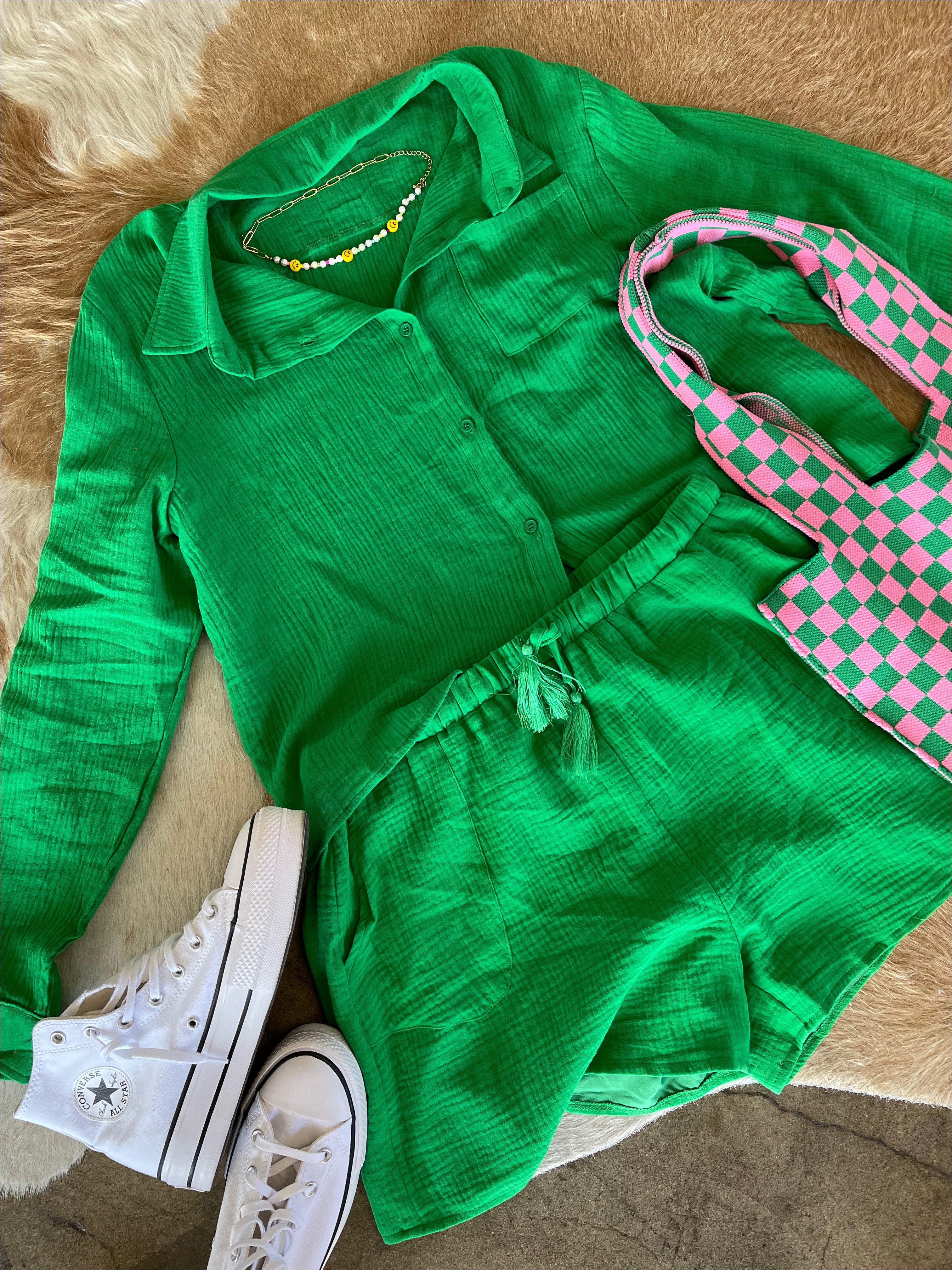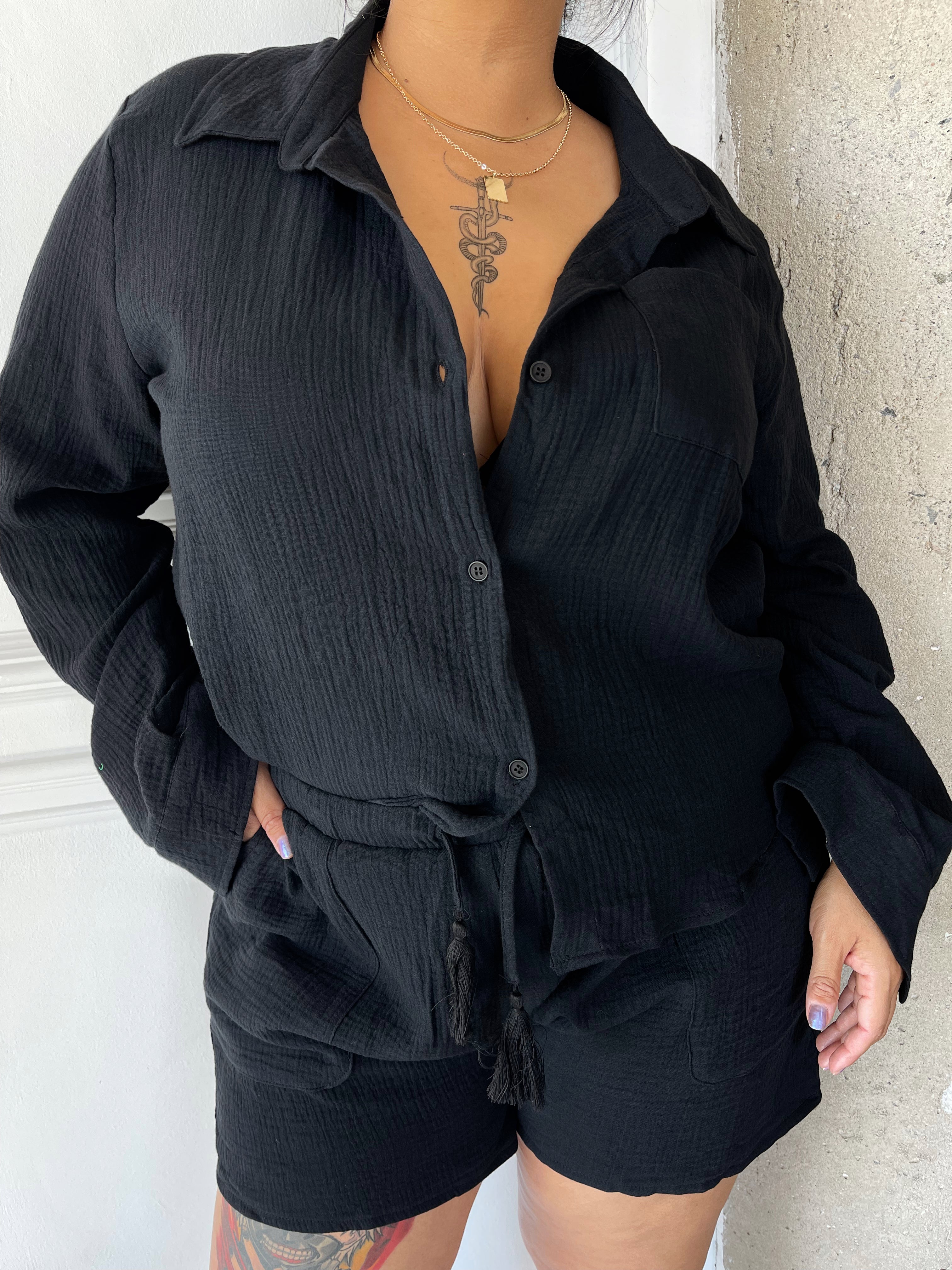 Take it anywhere, the ISLA set is perfect for a casual elevated fit. Features a gauze fabric, stretchy and breathable, long sleeves and button closures. Bottoms are lined and have pockets with adjustable waistband. Style together or separate.