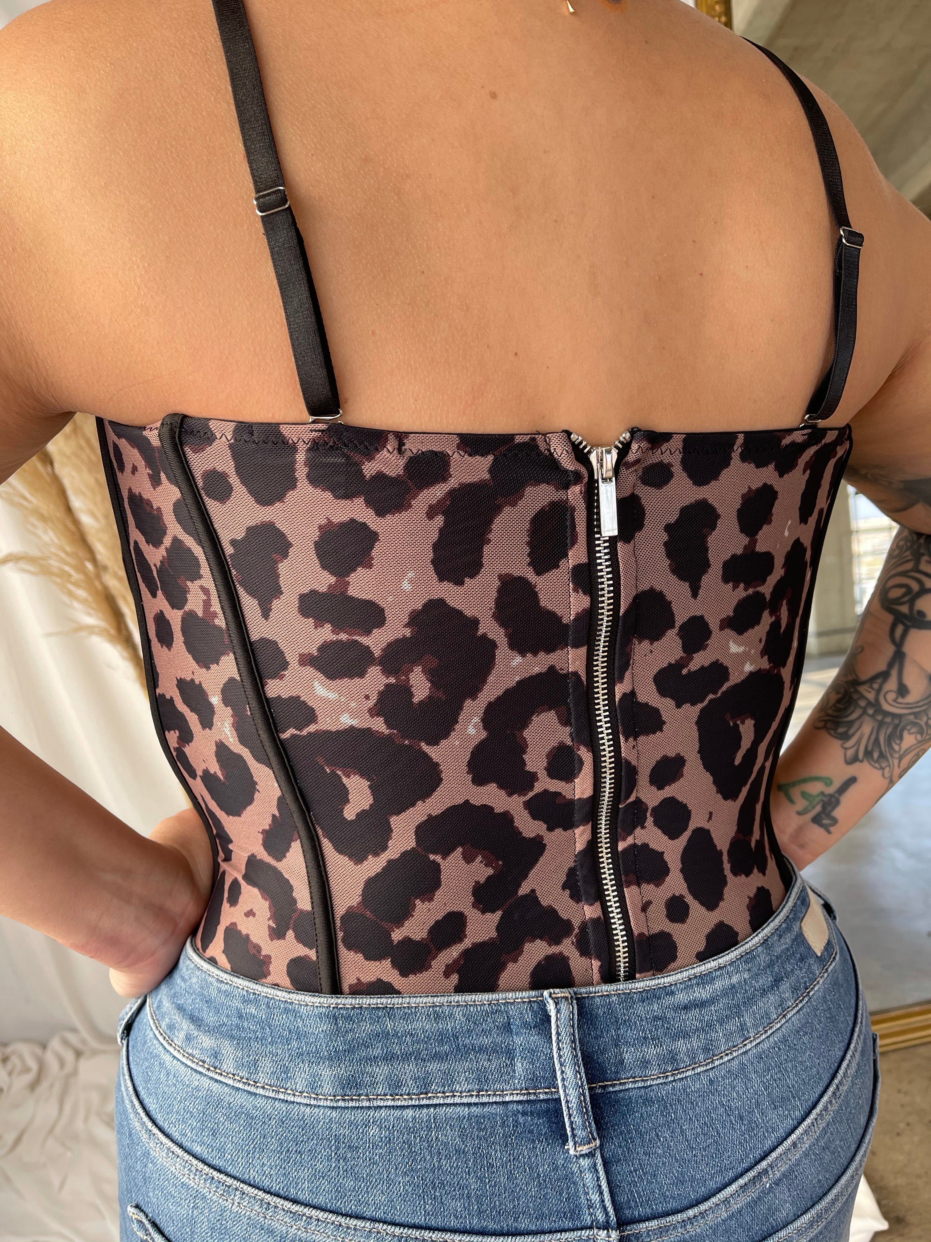 This corset features adjustable and removable straps, sheer mesh fabric and mild boning for a form fitting fit. Wear alone or over t shirts for a sporty edgy vibe. Pair it with your fav jeans and heels for a chic vibe. Available in various prints.
