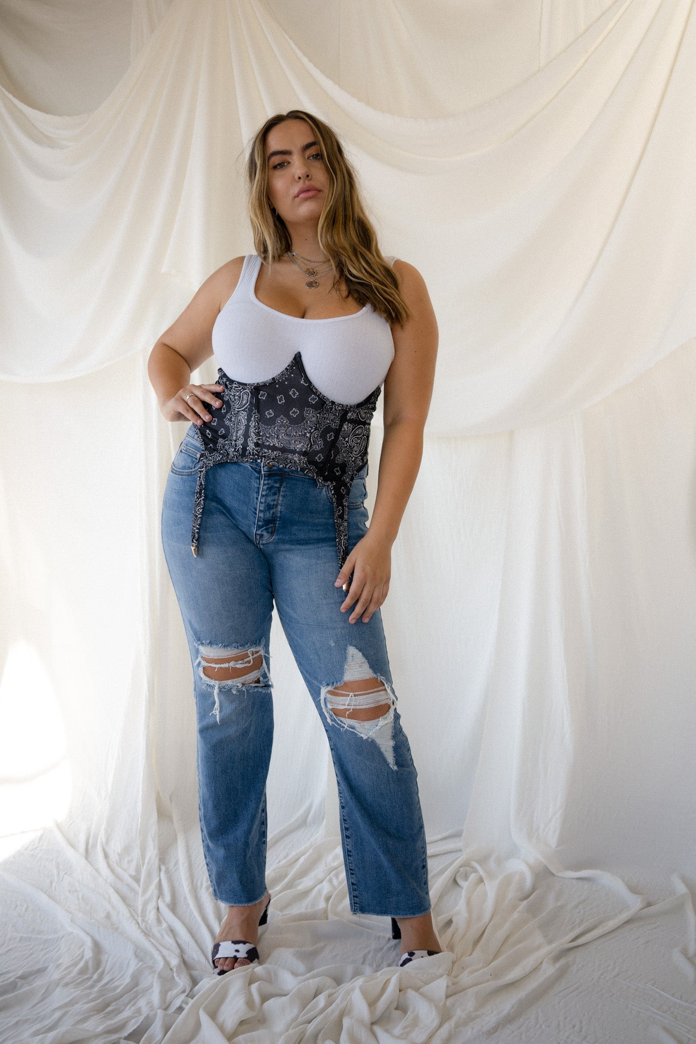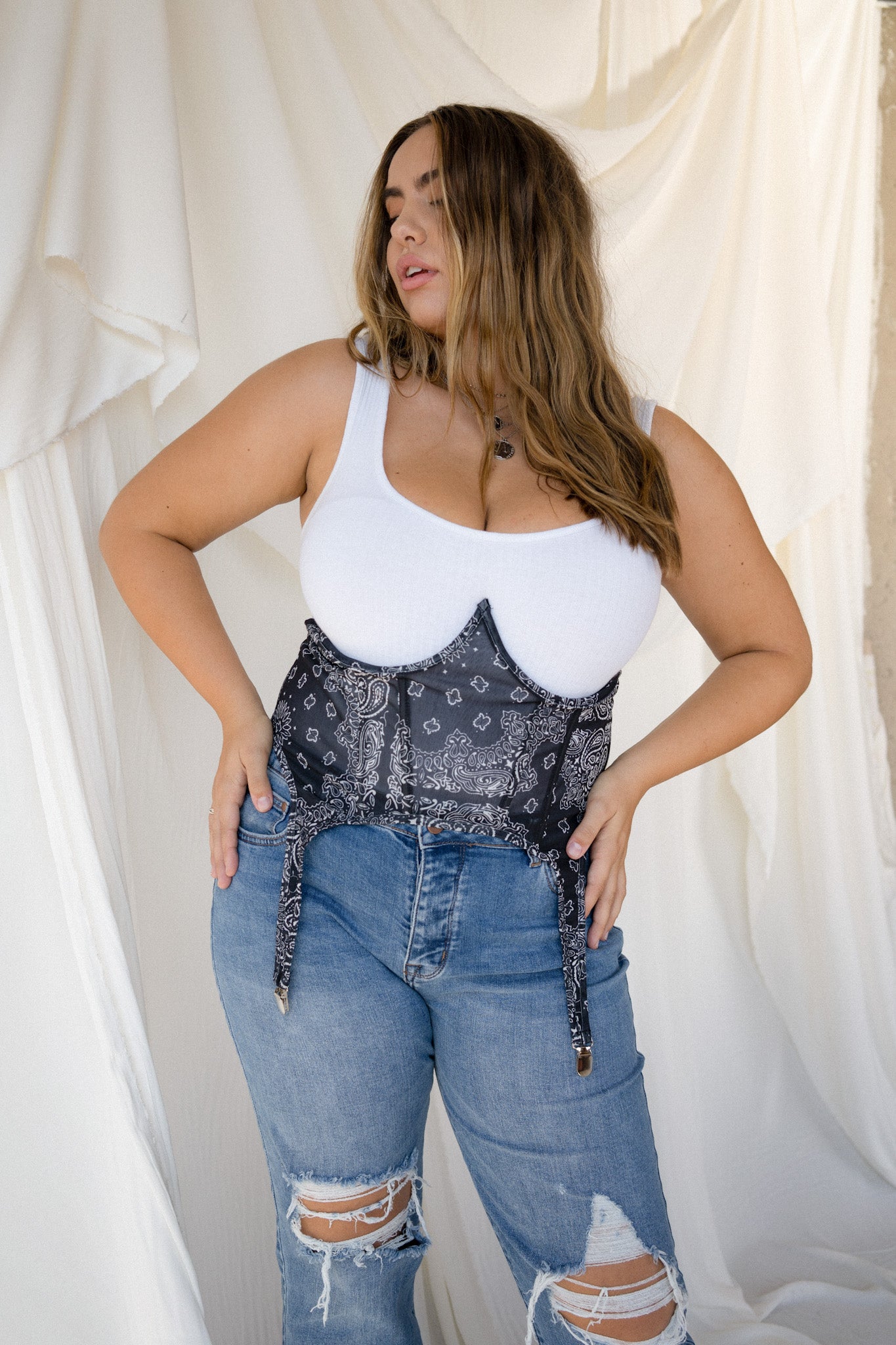 The LITA Under Bust Corset is strapless and features underwire, back zipper closure and stocking clips. The mesh sheer material also has mild boning for the perfect fit! The bandana print gives it a western flair. Style it with a black blazer and your favorite jeans or leather pants  for the perfect OOTD. (White top not included)