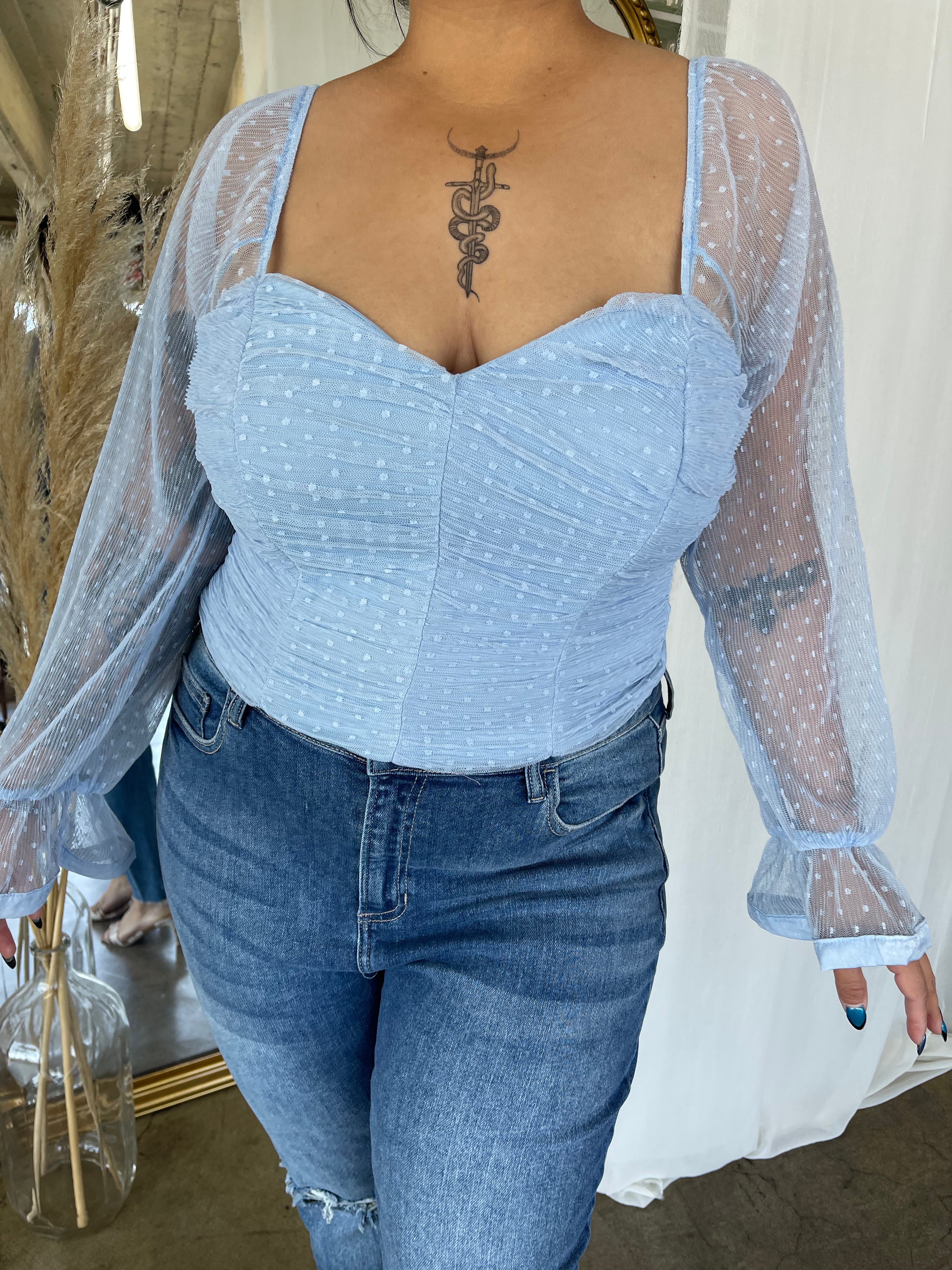 The perfect top for SUMMER, meet MARINA. Features a sweetheart neckline and a shirred bodice with zipper closure. Fully lined, only sleeves are sheer. Long sleeves that gather at the wrist and flare.