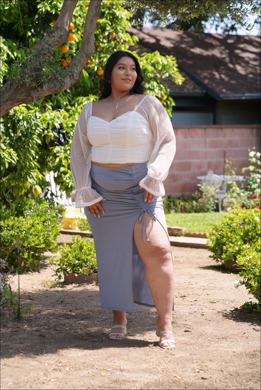 The perfect top for SUMMER, meet MARINA. Features a sweetheart neckline and a shirred bodice with zipper closure. Fully lined, only sleeves are sheer. Long sleeves that gather at the wrist and flare.