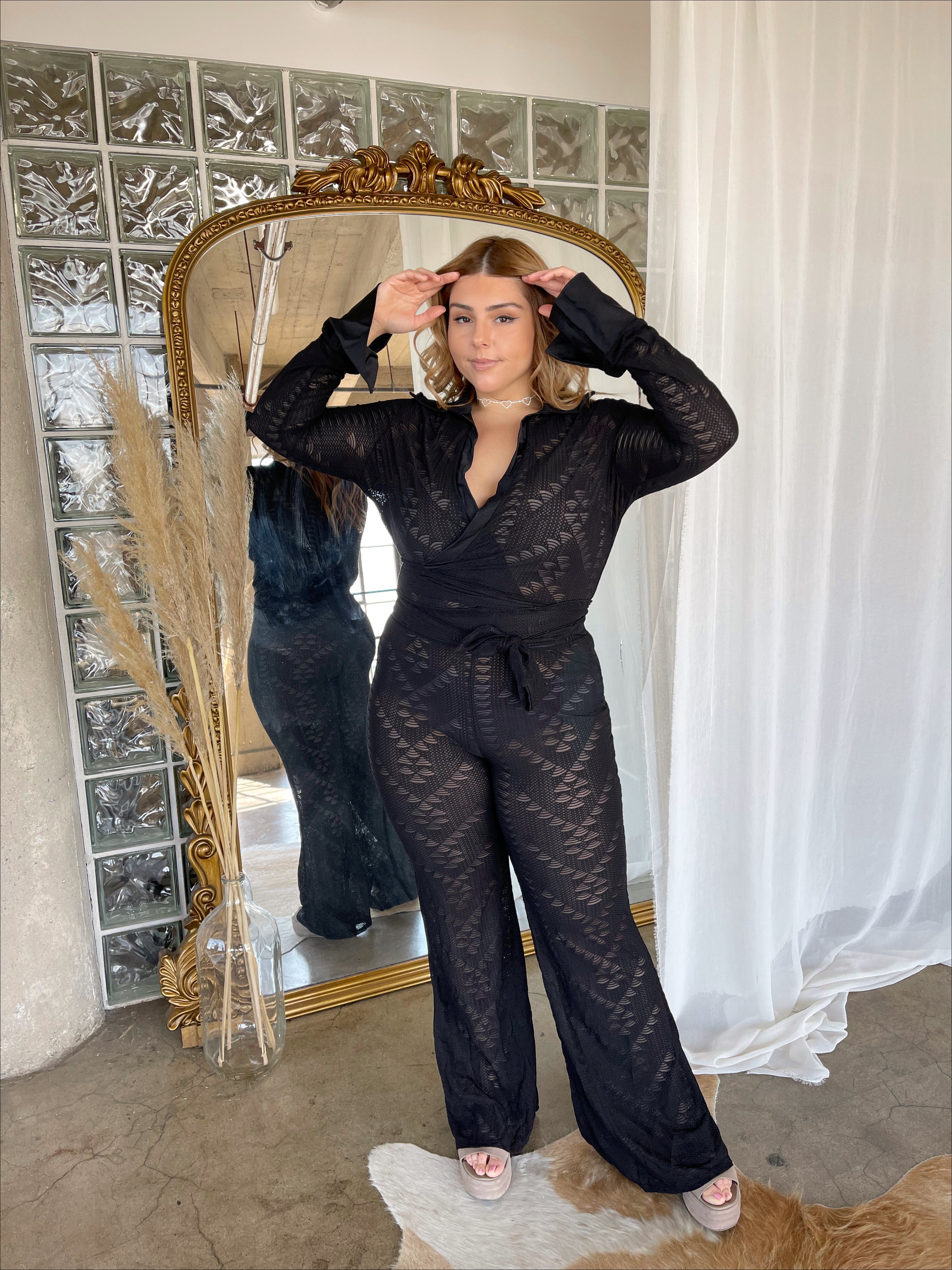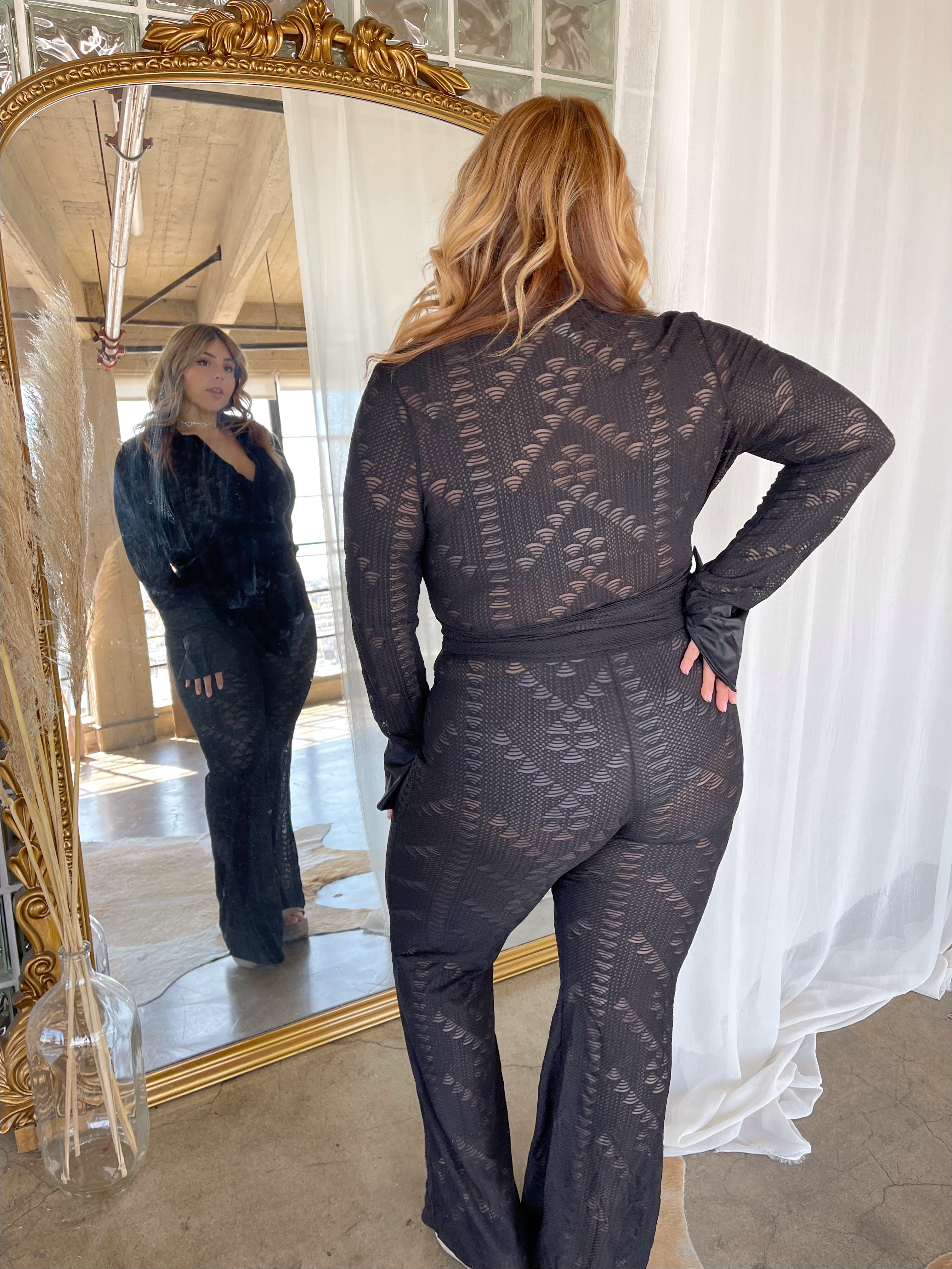 The MEMPHIS set features a sheer black lace design throughout, wrap style top, bell bottom pant with an elastic waistband. Collared detail on the top and bell sleeves, can be styled separate or together. Wear a high waisted pantie or biker shorts under if you'd like more coverage.