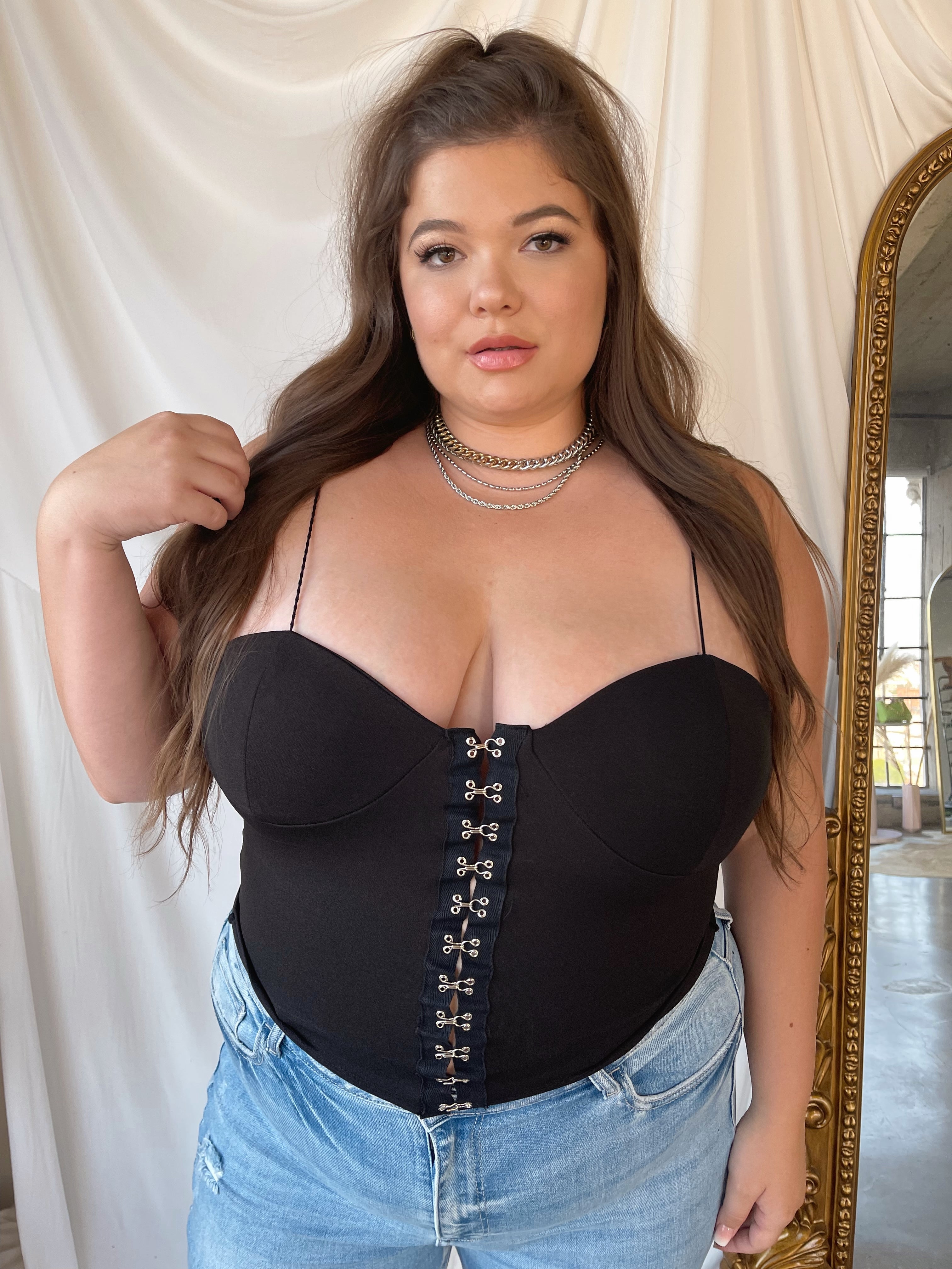 Your new favorite top, the MILLI features a faux hook eye closure and a sweetheart neckline with stretch. Team this with your favorite pair of jeans!