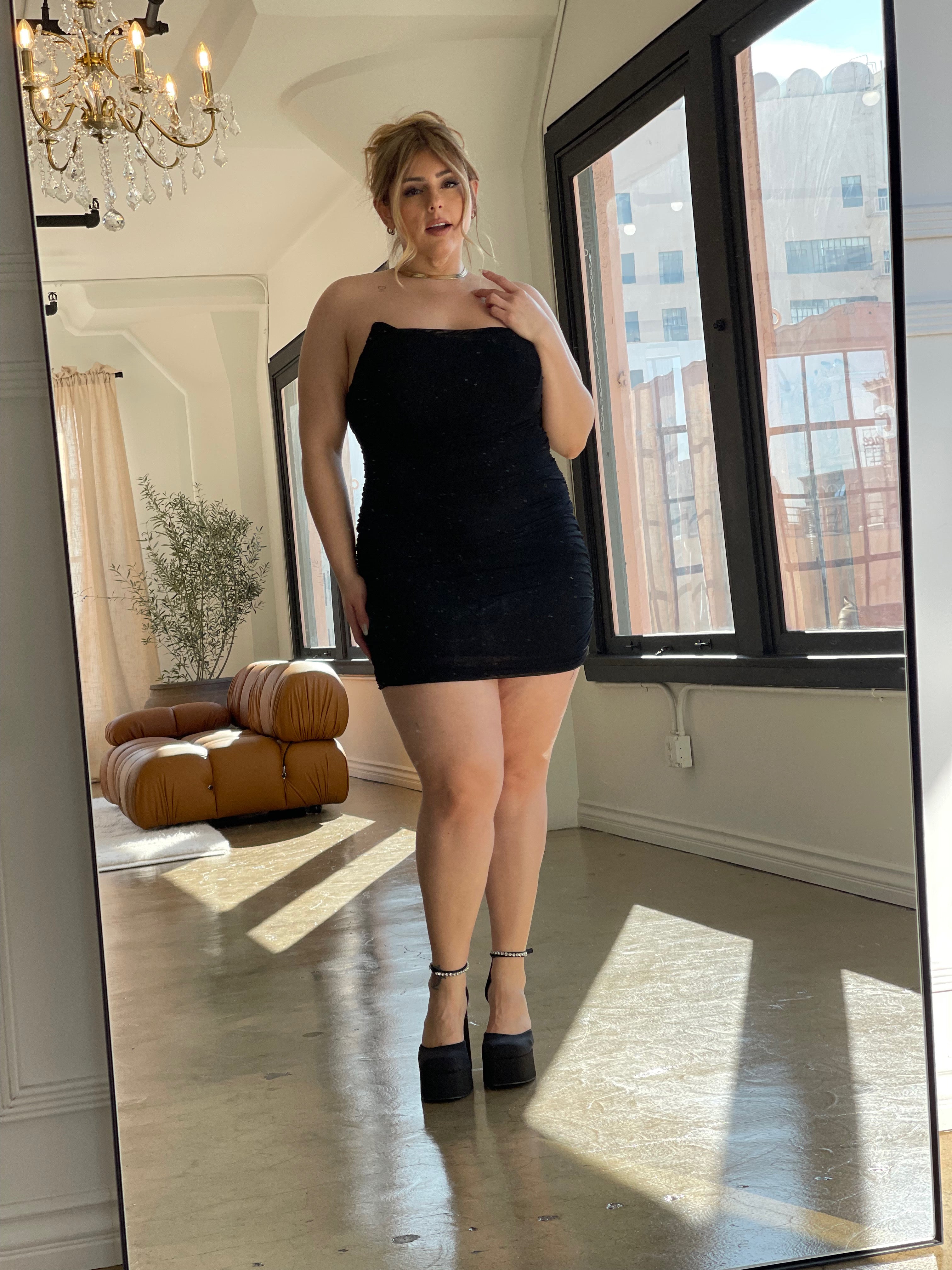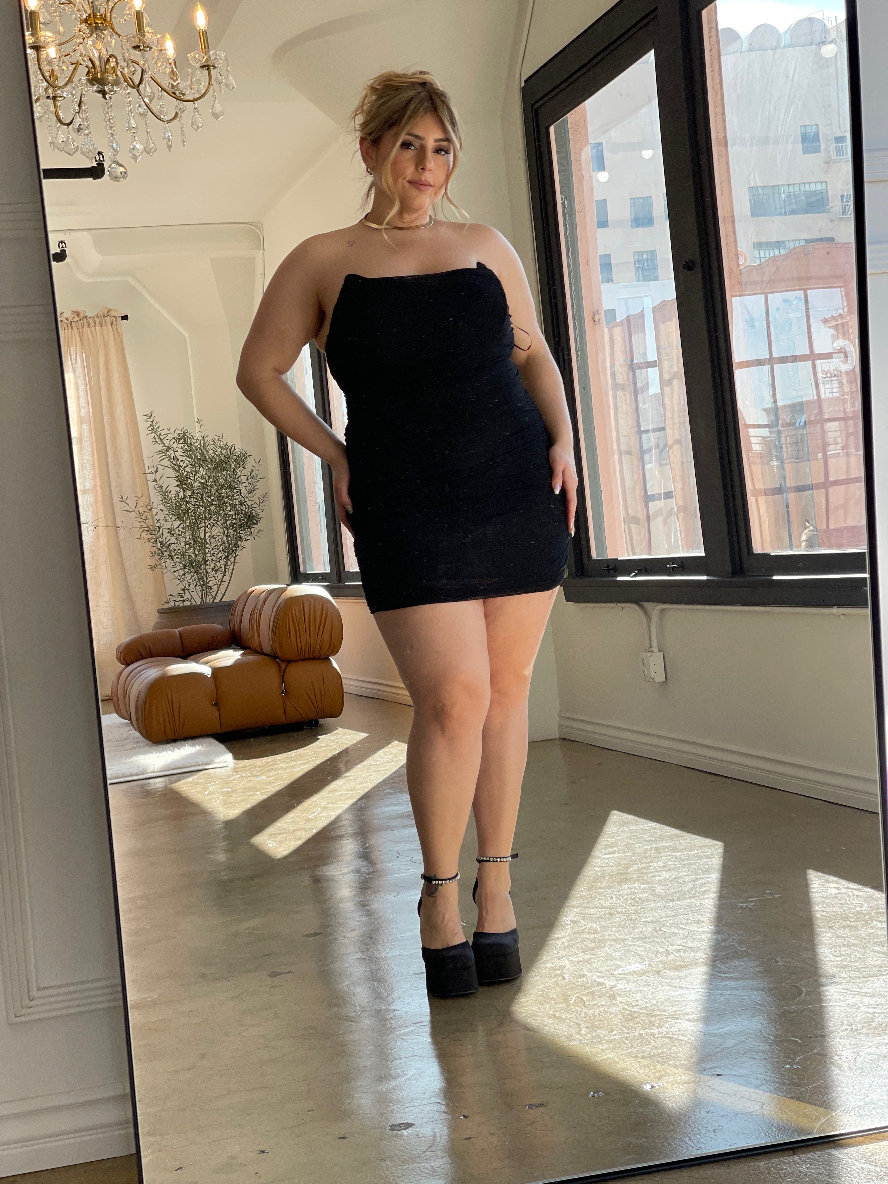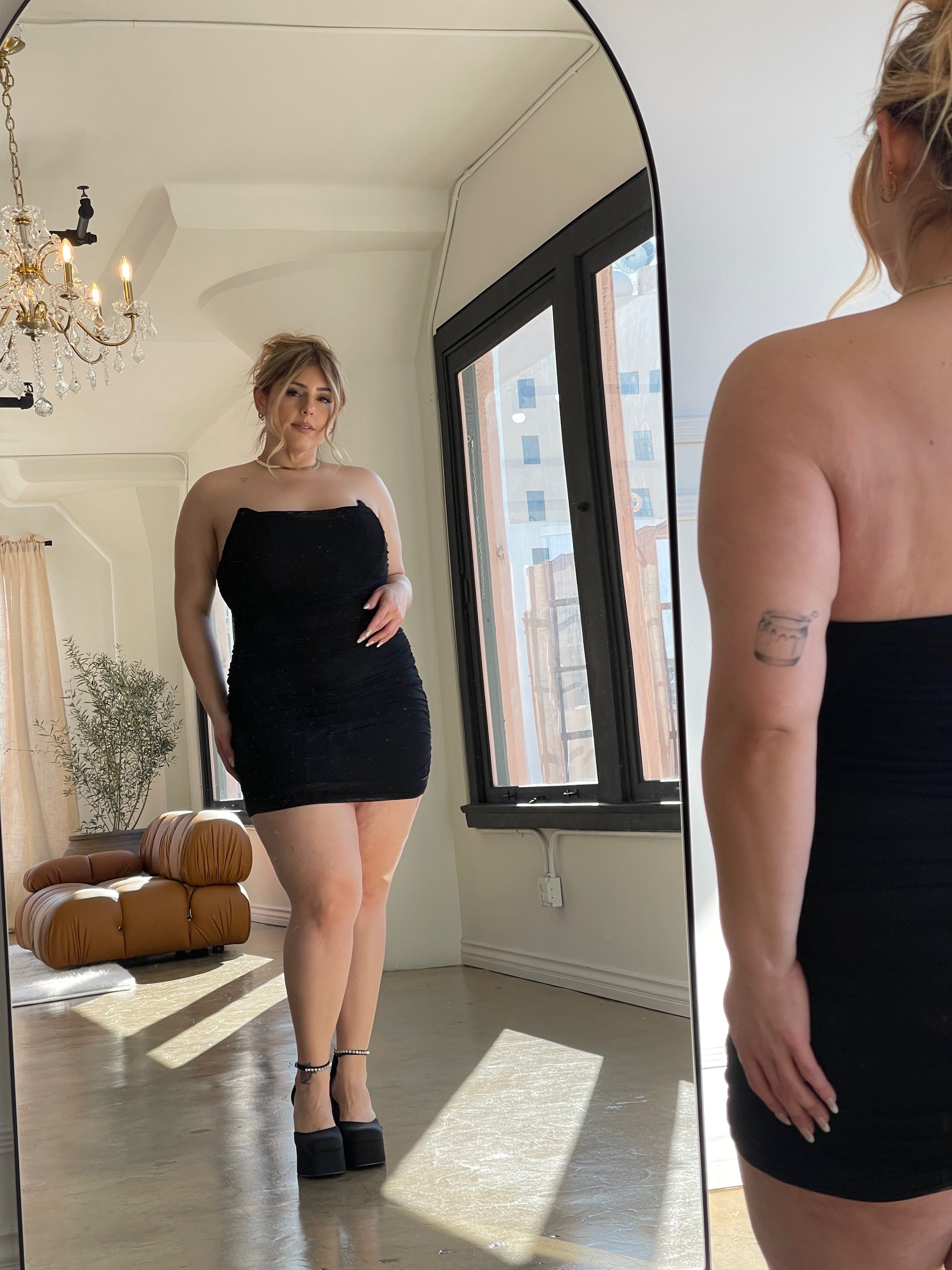 Need a LBD? You've found your perfect match. MINNIE features a unique neck like with a built in corset. The mild boning adds structure and the ruching detail throughout makes the perfect details. Zipper closure and offers a lot of stretch.