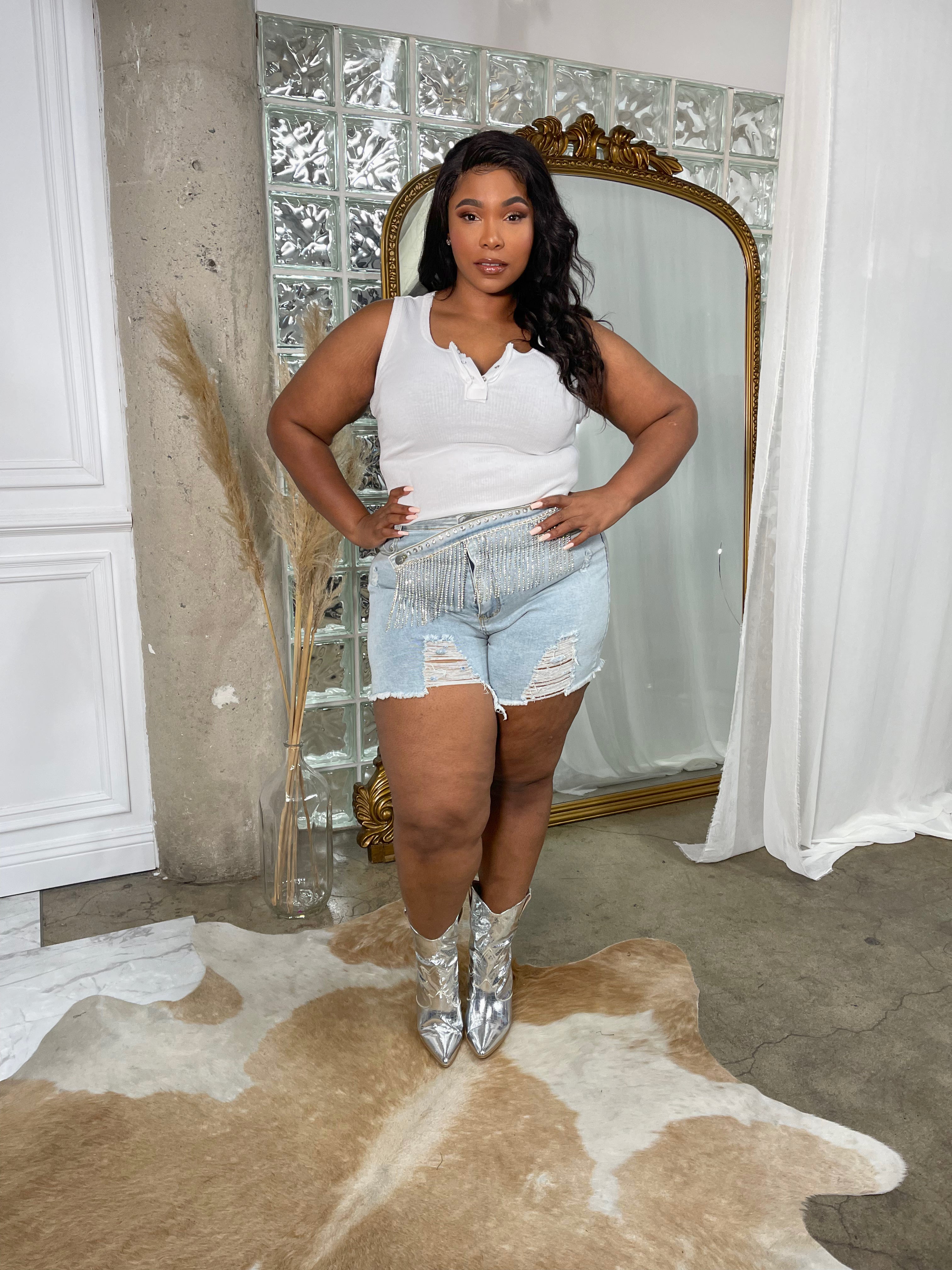 Just in time for Festival season, these shorts feature a Rhinestone belt overlay. Very Stretchy and comfortable with a 12" inseam, fit high waisted. Ripped distressed detail in a light wash. Silver tone hardware throughout, the best part the dangle Rhinestones!