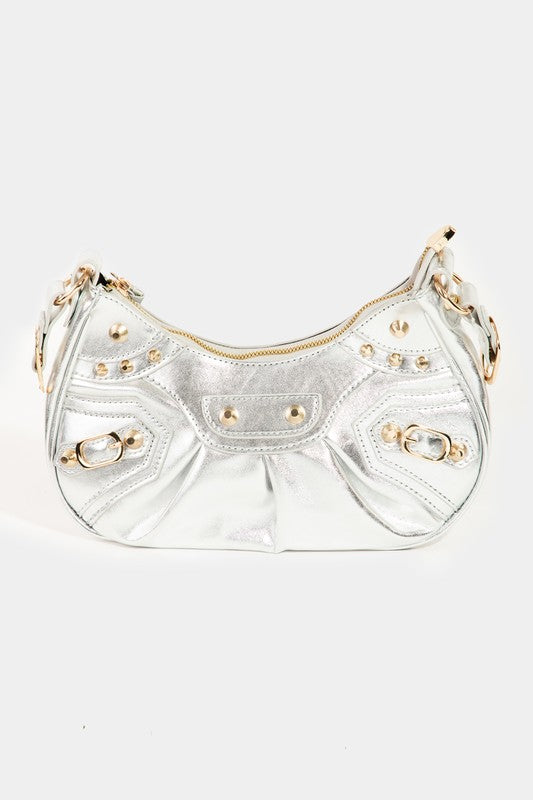 Introducing ROWAN- the chic metallic faux leather bag with a mini baguette silhouette and all the bells & whistles. It comes with a shoulder strap with grommet detailing, moto-inspired studded embellishments, a top zipper closure, and a saddle-style stitched shoulder pad. It's also equipped with a mini front zip pocket, a detachable zippered pocket & pouch, and a removable heart-shaped add on. Throw it on over any outfit!