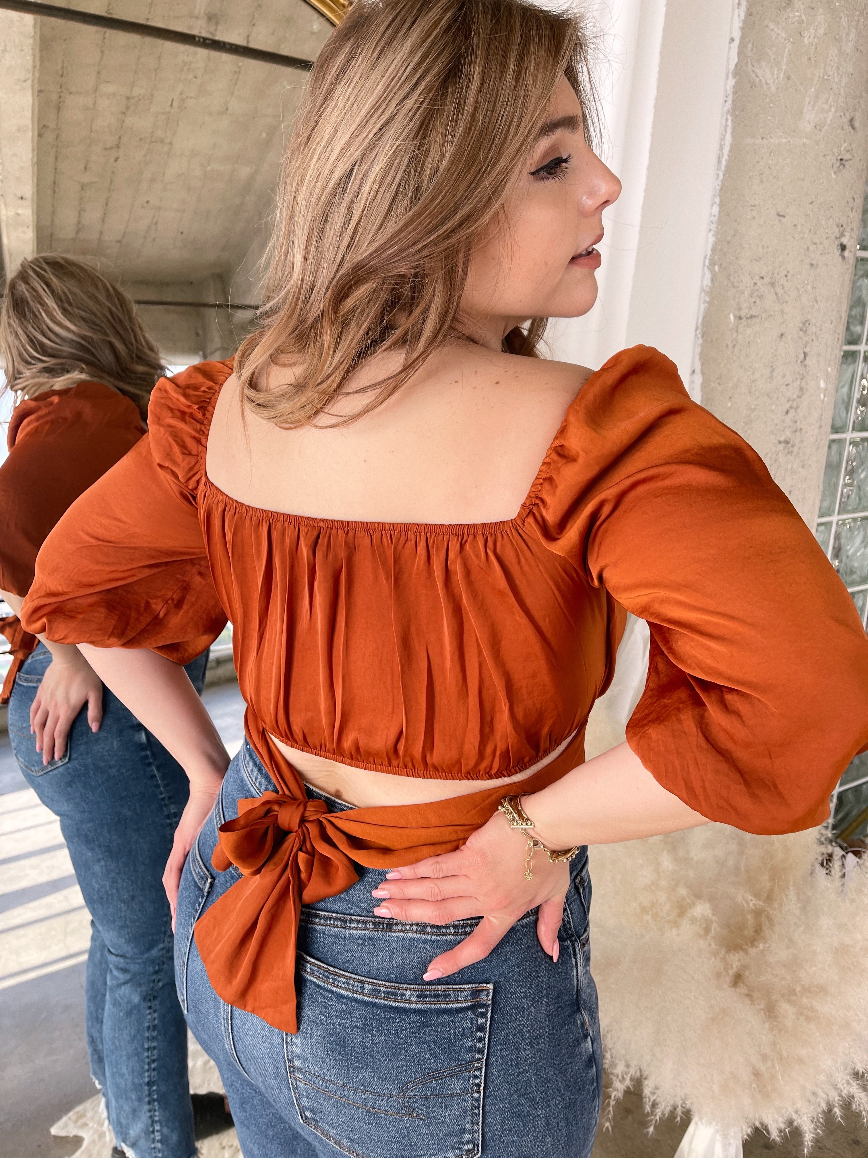 VIDA Bronze Satin Top with Back Tie Detail