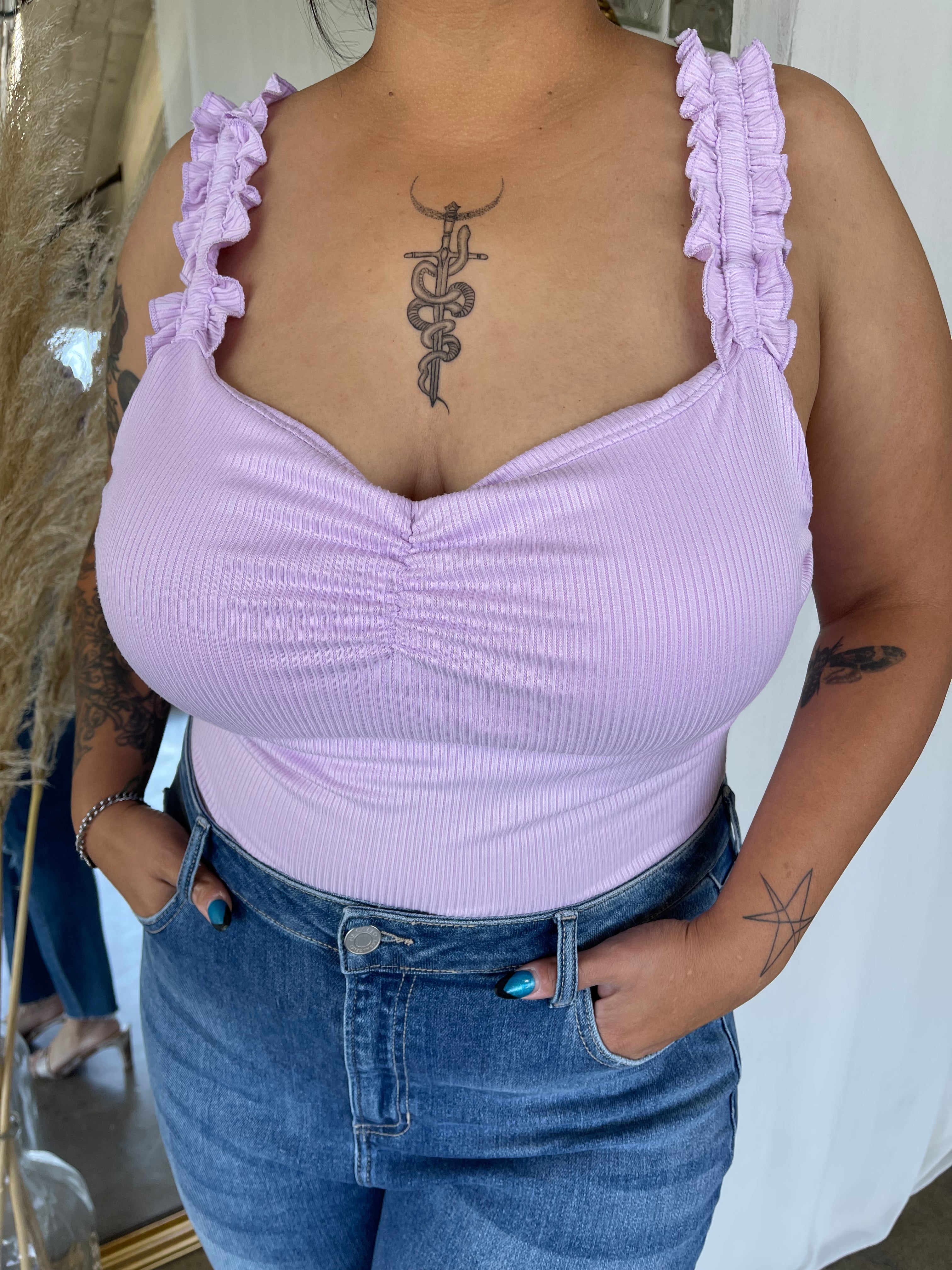 The perfect bodysuit just arrived! Very stretchy and soft fabric, built in pads with no wire. Features a ruffled cami design. Pair it with your fav denim or skirt!