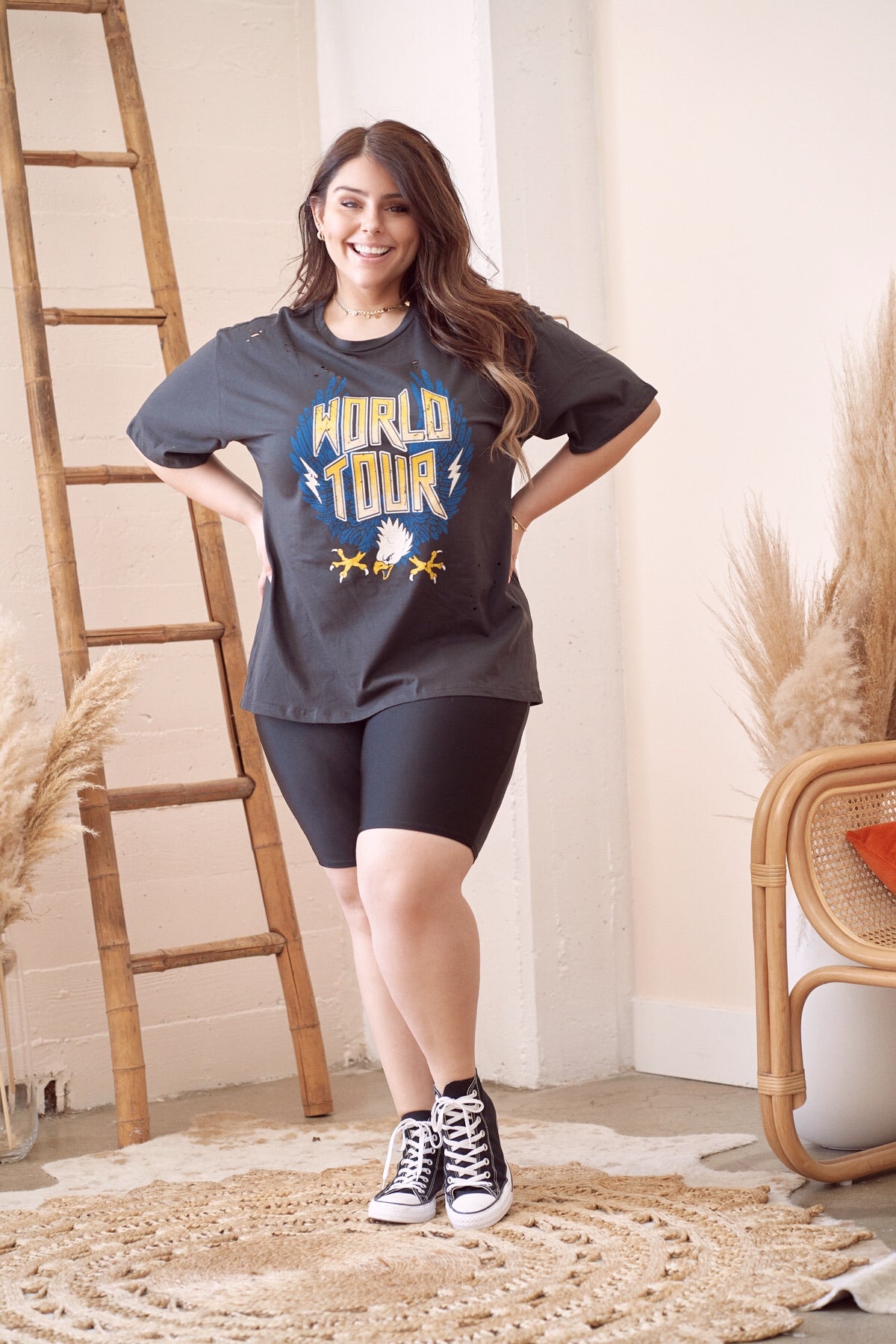 If you're like me, you've gone to more concerts than you can count and often daydreamed about going on tour. This t shirt is perfect to wear with jeans or shorts. We styled them with the AXEL biker shorts for a cool effortless and comfortable vibe!